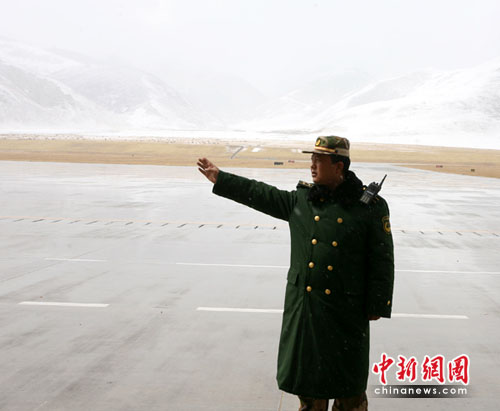 中新網(wǎng)青海玉樹4月22日電(石磊記者劉忠俊)22日5:10分,青海玉樹災(zāi)區(qū)陰云密布,天空下起大雪。為確保唯一空中生命線的暢通,武警青?傟(duì)駐巴塘機(jī)場(chǎng)官兵加強(qiáng)機(jī)場(chǎng)安全保衛(wèi)工作。