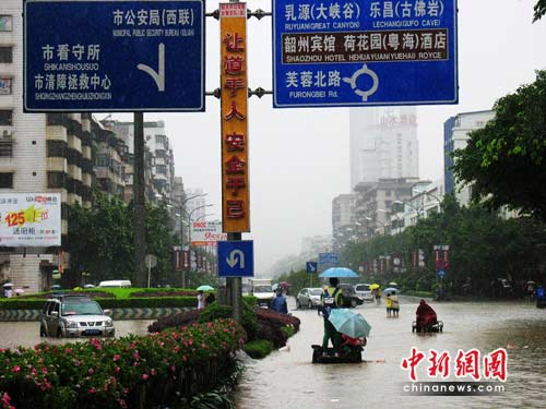 中新網韶關5月14日電(記者李凌)5月14日上午,一周前才遭受50年一遇洪災肆虐的廣東韶關又遭暴雨襲擊,多個地點出現(xiàn)內澇現(xiàn)象,特別是市區(qū)韶關大道、韶州賓館北出口,工業(yè)西大轉盤等7處水浸嚴重,導致交通中斷。
