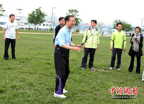 打了幾個(gè)回合,溫家寶興致更濃,索性脫下外套,雙方的比賽也更加激烈。打了約五、六分鐘后,溫家寶示意比賽停止,“你打得比我好,”他笑著說(shuō)。比賽結(jié)束后,兩位新結(jié)識(shí)的“球友”聊起了家常,告別時(shí),溫家寶說(shuō):“代我向你的家人問(wèn)好。”