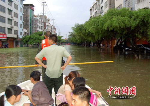 記者在來(lái)賓市實(shí)驗(yàn)中學(xué)看到,該校已成為一片湖泊。水深處約有1.6米,已經(jīng)淹過(guò)成年男子肩膀。水中七零八落飄散著住戶的生活用品,一樓居民已經(jīng)全部撤離。消防官兵自早上8時(shí)許開始對(duì)被困師生進(jìn)行救援,直至下午5時(shí),該校1100名被困師生及家屬全部撤至安全地帶。學(xué)校內(nèi)停電并且無(wú)法出行,影響了不少居民的正常生活。周邊幾家商鋪圍擋自家門口防止積水流進(jìn)店內(nèi),用各種器皿向外倒水。