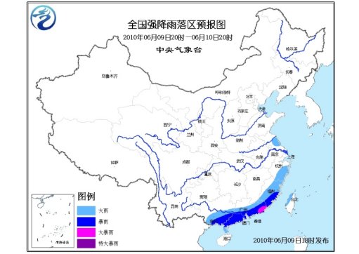 預(yù)計,6月9日20時到6月10日20時,江蘇東部、浙江南部、福建大部、廣東大部、廣西中南部、臺灣西北部等地有大雨,其中,福建南部、廣東中南部、廣西東南部等地有暴雨,局部有大暴雨;上述部分地區(qū)還將伴有短時雷雨大風(fēng)等強(qiáng)對流天氣。