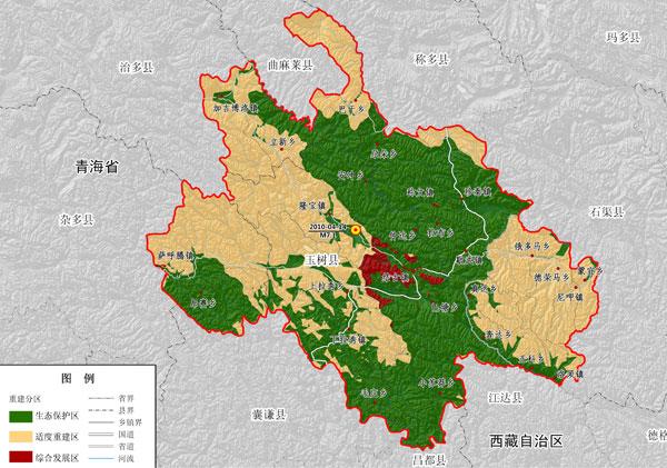 災(zāi)后恢復(fù)重建要與三江源、隆寶自然保護區(qū)規(guī)劃相銜接,根據(jù)資源環(huán)境承載能力綜合評價,將規(guī)劃區(qū)國土空間劃分為生態(tài)保護區(qū)、適度重建區(qū)和綜合發(fā)展區(qū)。