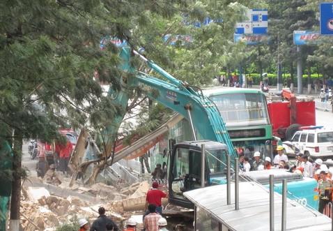 記者現(xiàn)場(chǎng)了解到,今天上午11時(shí)15分左右,云南飯店在拆遷過(guò)程中突然發(fā)生倒塌?繓|風(fēng)西路一邊正在被拆遷的一堵高大約7米的墻體砸向公交站臺(tái),一輛5路公交車(chē)正在站臺(tái)上下客,由于墻體離公交站臺(tái)非常近,正在下車(chē)的兩名乘客(一男一女)被砸傷。隨后,救護(hù)車(chē)迅速趕往現(xiàn)場(chǎng),目前,兩名傷者均已被送往醫(yī)院搶救,傷勢(shì)尚不清楚。