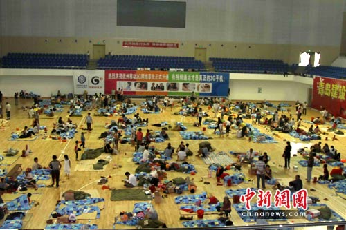 體育館內(nèi)鋪滿(mǎn)了被褥、涼席,有些老人和小孩還正在睡覺(jué)。有的床位已經(jīng)空出來(lái),工作人員介紹,這些人大多轉(zhuǎn)投親友去了。記者發(fā)現(xiàn),盡管體育館內(nèi)人很多,但一點(diǎn)也不嘈雜,很多人就躺在被子上,靜靜地望著十幾米高的天花板。