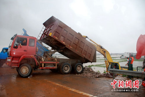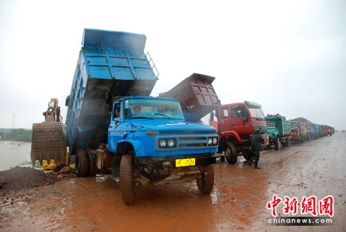 中新網(wǎng)臨川6月24日電(張見悅 劉占昆 何柳斌)江西撫河唱?jiǎng)P段數(shù)百米米決口封堵方案已經(jīng)確定,24日中午,記者在福銀高速撫河大橋看到,大批工程車輛運(yùn)載石料,準(zhǔn)備鋪就一條運(yùn)輸通道延伸向決口初,決口封堵的外圍工程在雨中開始緊張進(jìn)行。