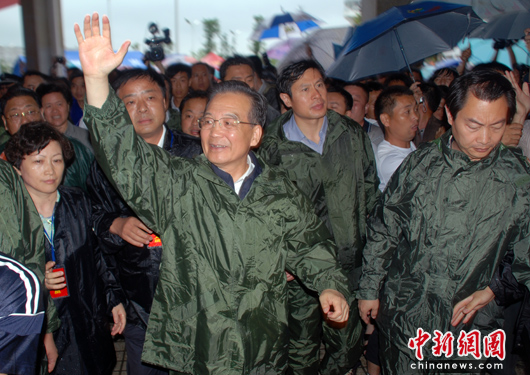 當(dāng)日上午,溫家寶冒雨深入重災(zāi)區(qū)撫州羅針鎮(zhèn),察看汛情、災(zāi)情,看望受災(zāi)群眾,慰問奮戰(zhàn)在抗洪搶險一線的解放軍、武警、公安消防官兵。