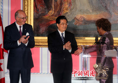當(dāng)?shù)貢r間24日上午,正在這里進行國事訪問的胡錦濤在加拿大總督府會見加拿大總督米夏埃爾•讓。會見前,米夏埃爾•讓夫婦為胡錦濤的到訪舉行了隆重的歡迎儀式。米夏埃爾•讓還發(fā)表了熱情的歡迎辭。
