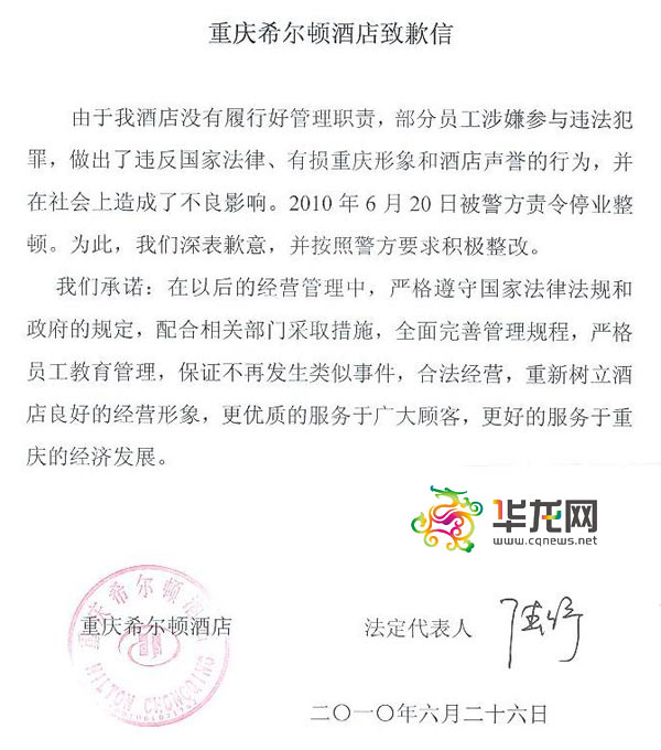 2010年6月20日,重慶希爾頓酒店因股東涉黑,介紹、容留婦女賣淫,違法經(jīng)營(yíng)和故意擾亂社會(huì)秩序,被重慶警方責(zé)令停業(yè)整頓。今日16時(shí)40分,重慶希爾頓酒店法定代表人陸紓,通過華龍網(wǎng)記者就此事公開發(fā)表致歉信,承諾合法經(jīng)營(yíng),更好地服務(wù)重慶經(jīng)濟(jì)發(fā)展。