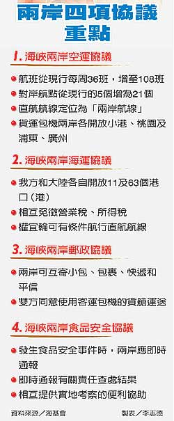 報(bào)道說,兩會(huì)副董事長(zhǎng)、副會(huì)長(zhǎng)層級(jí)協(xié)商昨天敲定空運(yùn)、海運(yùn)、郵件及食品安全等四項(xiàng)協(xié)議,今天將由海基會(huì)董事長(zhǎng)江丙坤及海協(xié)會(huì)會(huì)長(zhǎng)陳云林舉行二次江陳會(huì)談,簽署協(xié)議。其中空運(yùn)、海運(yùn)、郵件等三項(xiàng)協(xié)議在簽署四十天后生效,食品安全協(xié)議在七天后生效。