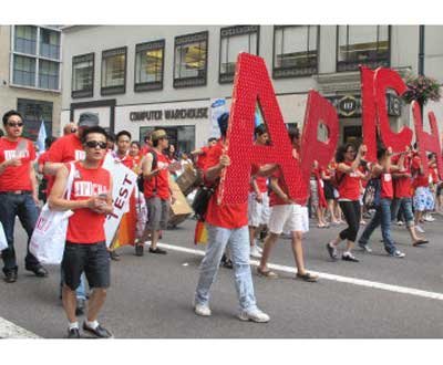 亞裔隊(duì)伍由巨大的彩虹字幅“Asian Pride”打頭陣,數(shù)十人演奏亞洲樂(lè)器,吸引民眾注意力,緊隨其后的是專門為亞裔女同志設(shè)立的Q-Wave團(tuán)體。“亞太裔艾滋病聯(lián)盟”(APICHA)主打“免費(fèi)HIV檢測(cè)”計(jì)劃,近百位身穿紅色T恤的成員們手舉標(biāo)語(yǔ),向沿路民眾分發(fā)安全套。