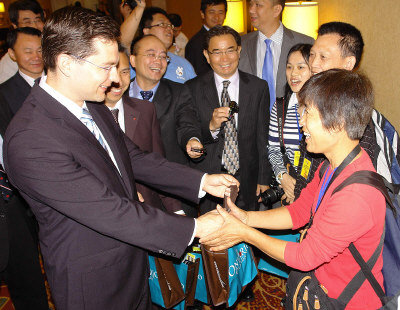 在與杜江等人會晤后,柏利文也代表哈珀總理,向首發(fā)團廣東中旅團員致贈紀念品,并一一握手問好、寒暄與交談。