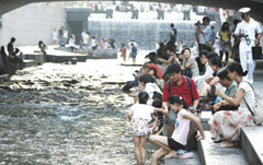 王某一家人從免稅店出來走向清溪川。清溪川是在中國也很有名的旅游景點。雖然是晚間時分,但天氣依然炎熱。王某的兩個兒子跳入水中。稍后而來的其他游客也脫掉鞋子進(jìn)入水中。一位游客說:“很涼快,很舒服。孩子們也很喜歡。在城市中心建設(shè)小溪,感到很羨慕!