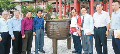 南方學(xué)院院長祝家華說,銅制的“南方之鼎”由新加坡藝術(shù)家陳瑞獻設(shè)計,在廈門制作,耗費5萬令吉,重200公斤,高160公分!笆紫嘣诮舆^火炬后,會在南方之鼎內(nèi)點燃圣火,過后將永久存放南院,象征人文精神永留于此!