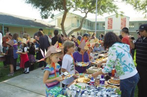 在18日的感恩節(jié)聚會上,家長們與老師們配合,給孩子送上美味的食品。(蔚宇)