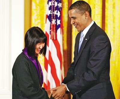 中新網(wǎng)2月27日電 據(jù)美國(guó)《世界日?qǐng)?bào)》報(bào)道,20歲那年設(shè)計(jì)華盛頓越戰(zhàn)紀(jì)念碑而一夜成名的華裔建筑師林瓔(Maya Lin),當(dāng)?shù)貢r(shí)間25日晚在白宮獲奧巴馬總統(tǒng)頒發(fā)2009年國(guó)家藝術(shù)獎(jiǎng)?wù)。林瓔這項(xiàng)成功的設(shè)計(jì)已和美國(guó)歷史融為一體。