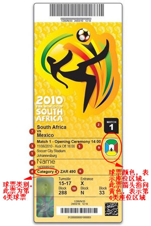 需要特別提醒的是,外國(guó)球迷僅可持前3類球票進(jìn)場(chǎng)觀賽。第4類球票僅限南非公民持身份證使用,外國(guó)球迷使用此類球票無法入場(chǎng)(見例圖)。殘疾人專用球票僅限殘疾人觀賽使用。