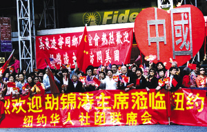 9月21日,中國國家主席胡錦濤抵達(dá)紐約出席聯(lián)合國峰會,美國東部地區(qū)3000華人華僑聚集在紐約曼哈頓華爾道夫酒店附近,熱烈歡迎。歡迎人群來自紐約、新州、賓州、康州等地,大紐約地區(qū)各大高校也組織了上千留學(xué)生前往歡迎,F(xiàn)場有鮮艷的國旗及醒目多樣的歡迎標(biāo)語,歌聲雷動、歡呼聲不斷!稅畚抑腥A》、《大中國》、《歌唱祖國》等歌曲回蕩在曼哈頓上空。不少歡迎者更是興奮地跳起了舞,歡迎遠(yuǎn)方的貴客。歡迎人群中年齡最小只有10個月大,最大的已經(jīng)80多歲。中國駐美大使周文重代表胡錦濤向歡迎隊(duì)伍,以及美國的所有華人表示感謝。