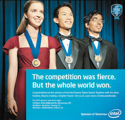 英特爾在廣告中的標題及內(nèi)容都很簡單。標題為“科學獎競爭激烈,贏家是全世界!睆V告內(nèi)容指出,恭賀所有在英特爾科學獎的優(yōu)勝者及進入最后準決賽參賽者,他們創(chuàng)造了更光明的未來。