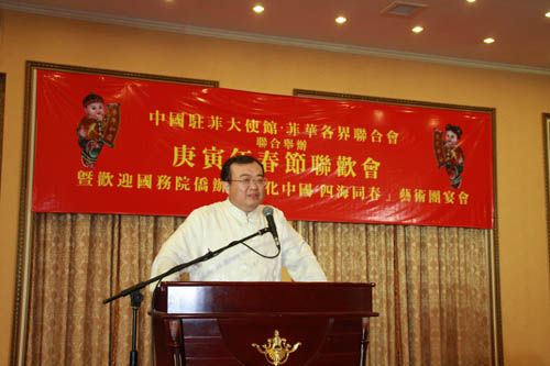 當天晚上,中國駐菲律賓大使館和菲華各界聯(lián)合會舉辦盛大的聯(lián)歡晚宴,歡迎藝術(shù)團的到來。菲華各界聯(lián)合會主席戴宏達、中國駐菲律賓大使劉建超、藝術(shù)團團長熊昌良分別發(fā)表熱情洋溢的致辭。在致辭中,戴宏達主席和劉建超大使對國務(wù)院僑辦組派如此高水準的藝術(shù)團來菲演出表示感謝,各位藝術(shù)家放棄在春節(jié)與家人團聚的機會,千里迢迢赴海外慰問僑胞,用歡快的歌聲和舞蹈為海外僑社增添了喜慶的春節(jié)氣氛。全體旅菲僑胞將翹首期盼藝術(shù)團的演出取得圓滿成功。