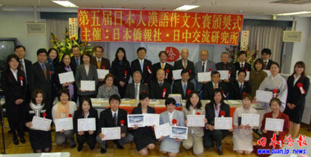 “第五屆日本人漢語作文大賽”共有36名應征者獲獎,中國駐日使館許澤友總領(lǐng)事代表程永華大使為川松若菜(學生組)和佐藤美緒子(社會組)頒發(fā)了“中國大使獎”。
