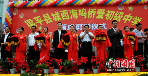 中新網(wǎng)梁平6月21日電 (記者 郭晉嘉)21日,重慶市梁平縣城西海鳴僑愛中學(原梁平城西中學)竣工落成,國僑辦副主任馬儒沛、僑愛中學捐資人屠海鳴等出席落成剪彩儀式。