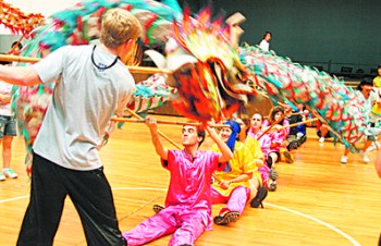 鑼鼓聲中,湖南涉外經(jīng)濟學院舞龍舞獅隊千變?nèi)f化的動作,讓美國學生感到震撼,也不忘嘗試一番中國龍的韻味。而南棍和太極等中國功夫更讓美國學生興致高漲。期間,美國學生擺弄起中國的筆墨紙硯,還真是有模有樣。