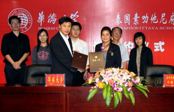 中新網(wǎng)10月27日電 據(jù)華僑大學(xué)新聞網(wǎng)消息,10月24 日上午,華僑大學(xué)與泰國素叻他尼府華萌學(xué)校在華大廈門校區(qū)簽署合作備忘錄。華僑大學(xué)華文教育辦公室主任趙明光、泰國素叻他尼府華萌學(xué)校副經(jīng)理安蒙麗分別代表雙方在合作備忘錄上簽字。出席簽字儀式的還有泰國素叻他尼府華萌學(xué)校校董涂碧泉及華僑大學(xué)華文教育辦公室工作人員。