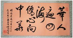 著名書法藝術(shù)家方向雄日前為華僑大學(xué)五十周年校慶題詞:“華人遍四!S心向中華”