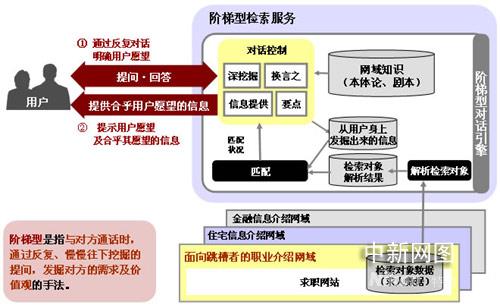 沖電氣與RECRUIT,共同開發(fā)設(shè)計(jì)了通過(guò)計(jì)算機(jī)向用戶提問(wèn),發(fā)掘用戶獨(dú)自無(wú)法表達(dá)的愿望及需求,從各種各樣大量的服務(wù)及內(nèi)容中找出與之匹配信息的“階梯型檢索服務(wù)”。去年本服務(wù)已經(jīng)被“信息大航海項(xiàng)目”作為模型服務(wù)之一所采納,進(jìn)行了圍繞階梯型對(duì)話引擎的系統(tǒng)技術(shù)開發(fā),在以約800用戶為對(duì)象的向跳槽者介紹職業(yè)的網(wǎng)域進(jìn)行了驗(yàn)證試驗(yàn)。結(jié)果表明,與用戶平均進(jìn)行了33次對(duì)話(系統(tǒng)提問(wèn),用戶回答后算一次對(duì)話),可以平均從用戶獲得32個(gè)屬性的信息。同時(shí)進(jìn)行了問(wèn)卷調(diào)查,24%的用戶回答通過(guò)對(duì)話得到了提示,了解了自己的需求,驗(yàn)證了通過(guò)與計(jì)算機(jī)對(duì)話,能發(fā)掘用戶自身沒(méi)有注意的需求。而且,沖電氣還從中獲知可以對(duì)該服務(wù)寄予極大期望,期待目前有54%,兩年后有75%的用戶能使用該服務(wù)。