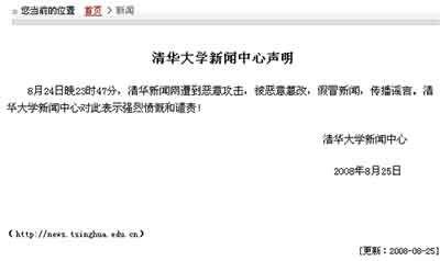 前天,清華大學新聞中心特為此發(fā)表了一篇聲明,該聲明中稱,8月24日23時47分,清華新聞網(wǎng)遭到惡意攻擊,被惡意篡改,假造顧秉林校長接受采訪的新聞,傳播謠言。清華大學新聞中心對此表示強烈憤慨和譴責。目前,清華新聞網(wǎng)已恢復正常運行。(記者 徐晶晶)