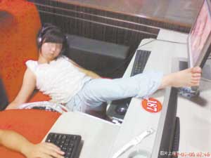 在這些被張貼出來(lái)的照片中,記者看到,有個(gè)漂亮妹妹戴著耳機(jī)不知道是在瞇著眼睛聽音樂(lè)還是已經(jīng)睡著了,一條腿放在電腦桌上;大多數(shù)上網(wǎng)者要么蜷縮在沙發(fā)上要么就坐在凳子上酣然熟睡;有的上網(wǎng)者手放在鍵盤上,可眼睛卻已經(jīng)閉上,嘴巴大張著;還有的則是男女混合躺在一起,任憑電腦屏幕閃個(gè)不停。