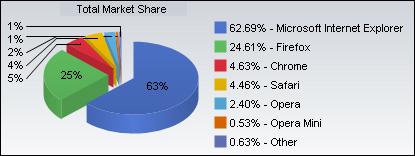 盡管如此,在過去的6個月中,IE市場份額幾乎每個月都要下降一個百分點。Net Applications預計,到2010年年中,IE份額可能跌至50%。