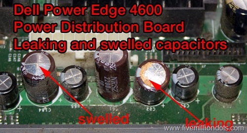 第一臺(tái)是PowerEdge 4600托管服務(wù)器,首先是四個(gè)熱插拔電源之中的一個(gè)出現(xiàn)問(wèn)題,導(dǎo)致服務(wù)器宕機(jī)。拆除問(wèn)題電源后,利用其他三個(gè)電源繼續(xù)運(yùn)轉(zhuǎn)了9個(gè)月時(shí)間。結(jié)果又有一個(gè)電源出現(xiàn)問(wèn)題。打開機(jī)箱后發(fā)現(xiàn),控制電源系統(tǒng)的主板部分的電容器出現(xiàn)了膨脹,泄露。
