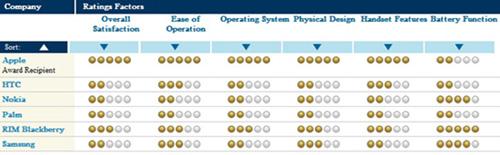 J.D. Power在手機(jī)的可操作性、操作系統(tǒng)、外觀設(shè)計、功能和電池功能5大方面進(jìn)行了調(diào)查,iPhone在前四項中均獲得滿分,只有在電池方面略遜于競爭對手。