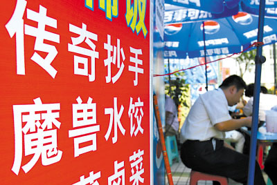 “來(lái)二兩魔獸餃子,再來(lái)一份屠龍刀!”凌晨1點(diǎn),在網(wǎng)吧拼殺5個(gè)小時(shí)后吃碗餃子,已經(jīng)成了網(wǎng)友“丁丁貓”的習(xí)慣。近日,在解放碑附近,一家以網(wǎng)絡(luò)游戲以及道具名稱(chēng)命名的面食店,逐漸走紅于街坊和網(wǎng)絡(luò)間。