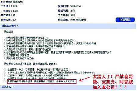 8月31日,網(wǎng)友“湘水悠悠”在爆料說,他在求職網(wǎng)上看到一個(gè)超級(jí)雷人公司招聘啟事,職位要求里面竟然有莫名其妙的規(guī)定:不屬于任何網(wǎng)絡(luò)教派,嚴(yán)禁春哥教、寂寞黨、時(shí)彩族加入本公司。
