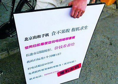 記者在論壇上看到,發(fā)帖的網(wǎng)友表示參照之前“強(qiáng)人”給她整理的手機(jī)賺錢指南,花費(fèi)50元做了兩塊廣告牌便和妹妹一起出租手機(jī)開始創(chuàng)業(yè)。論壇帖子中還附帶了網(wǎng)友舉著廣告牌在北京的地鐵站做宣傳的圖片。廣告牌上寫著“北京出租收集,食不果腹,租機(jī)求生,使用目前最優(yōu)惠的套餐,長途市話隨便打,價錢看著給,我的目標(biāo)是1個月賺5萬!打電話超過30分鐘,免費(fèi)提供板凳和按摩服務(wù)(我穿短裙)”。該名網(wǎng)友稱,“目前成本已經(jīng)掙回,滾滾大洋正在朝我們奔騰而來,大家還有什么高招趕快說”。昨日,記者曾嘗試撥打廣告牌上的聯(lián)系方式與該網(wǎng)友聯(lián)系,但被告知為空號。