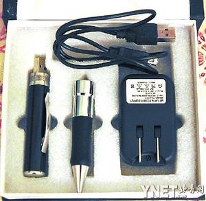 在談好280元的價(jià)格后,店主從柜臺(tái)的角落里拿出了一個(gè)上鎖的黑包,打開后從里面拿出了一個(gè)黑色的盒子,上寫英文“MP9 Digital Pocket Video Recorder”(MP9數(shù)字口袋攝像機(jī))。整套產(chǎn)品由四部分構(gòu)成:筆頭、筆桿、充電器和USB線。該筆外形與一般的圓珠筆相差不大,其中筆桿為“偷拍筆”的核心部分,筆桿的頂端有一個(gè)開關(guān)按鈕,筆夾的上方有一個(gè)針眼攝像頭,筆桿背面有兩個(gè)小孔,上方小孔是指示燈,下方為收音孔。筆桿最下端有一個(gè)USB的接口,起到傳輸畫面的作用。據(jù)店主介紹,筆桿里面還有一個(gè)U盤存儲(chǔ)器,大小由2G到8G不等。