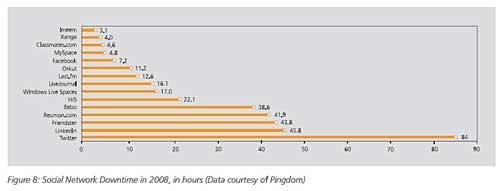 Twitter去年宕機時間至少是其競爭對手的2倍,其2008年的總宕機時間為84小時,排名首位。