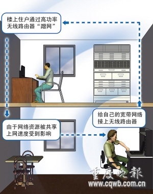 但家中產生的無線網絡信號,往往樓上樓下都能收到,如果無線網絡沒設密碼,別人只要收到信號就能免費使用,即“蹭網”。按重慶ADSL寬帶包月價80元計算,“蹭網”者一年可以省下近1000元。