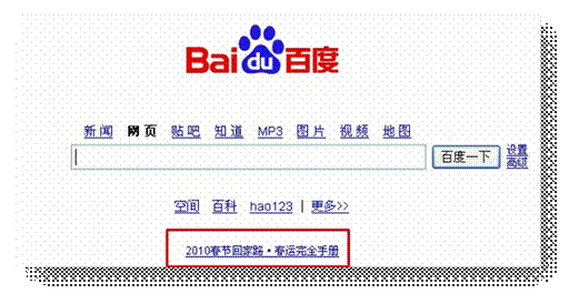 2月3日零點,百度、去哪兒網(wǎng)聯(lián)合制作的“2010春節(jié)回家路•春運完全手冊”專題上線發(fā)布,同時專題入口被放置在最引人注目的百度網(wǎng)站首頁。這是繼2009年“英特爾·影響明天的是誰?”專題后,百度2010年第一次啟用首頁資源的重大動作。