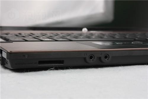 機(jī)身右側(cè),這里安置有電源適配器接口、DVD刻錄光驅(qū)和2個(gè)USB2.0接口,將USB/eSATA接口設(shè)計(jì)在近端雖然使插拔更加方便,但可能對(duì)鼠標(biāo)操作有所限制,是一把雙刃劍。