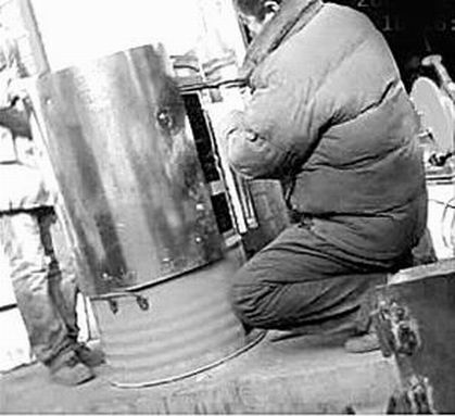 昨天(12月24日),記者來到天橋區(qū)臧家屯小區(qū)附近,一條街旁有幾家加工鐵爐子的業(yè)戶,其中一家業(yè)戶前擺著一些大鐵桶,業(yè)戶在一個藍色的大鐵桶前忙活著。記者走近一看,業(yè)戶在加工地瓜烤爐,他給藍色的大鐵桶包上半米高的白色鐵皮!澳氵@里加工地瓜烤爐嗎?多少錢一個?”記者問!300多元一個。”業(yè)戶指著正在加工的大鐵桶說,“這個烤爐已經(jīng)有人買了,你如果想要烤爐,先挑個鐵桶吧!