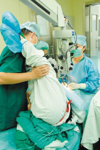 考慮到病人身體的特殊情況,手術(shù)中,醫(yī)生只能始終扛著她的雙腿,并將臀部抬起,才能實(shí)施。但是由于拆除白內(nèi)障是十分精密的手術(shù),全過(guò)程都要在顯微鏡下進(jìn)行,負(fù)責(zé)扛腿的醫(yī)生只要使患者身體有一絲抖動(dòng),不僅會(huì)使手術(shù)失敗,還可能造成眼球破損,導(dǎo)致終身失明。為此,他們特意安排了多名身體強(qiáng)壯的醫(yī)生,輪流扛著患者腿部。