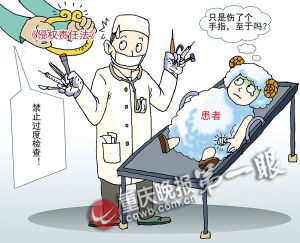 “下月起,醫(yī)院再對患者進行過度檢查屬于違法!敝貞c合縱律師事務所徐桂鵬律師介紹,《侵權(quán)責任法》7月1日起正式施行,該法對過度檢查作了明確禁止性規(guī)定。