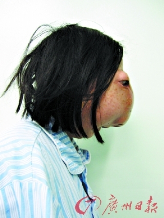 “活檢結(jié)果還沒出來(lái),基本確定是‘骨纖維異常增殖癥’,其實(shí)也就是她的顱腦內(nèi)、頜面部有著巨大腫瘤!绷钨F清教授表示,她的腫瘤與頭部等大,雖然呈良性無(wú)礙生命,但嚴(yán)重影響其生活。