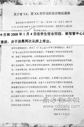 1月4日,廣州大學(xué)城某工業(yè)大學(xué)一女生留男生在宿舍過夜被學(xué)校抓獲,兩人近日被學(xué)校記過處分。這是該校在大學(xué)城校區(qū)首次對(duì)男女同宿現(xiàn)象公