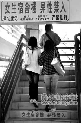 下午4點(diǎn),記者在其中一棟男生樓進(jìn)行了觀察。30分鐘內(nèi)共有5名女生,從沒設(shè)門崗的出入口進(jìn)入男生樓。1個(gè)手提快餐,準(zhǔn)備上樓的女孩告訴記者,她常常到男生宿舍玩,“4年來好像只登記過1次,管理員極少上門檢查”。
