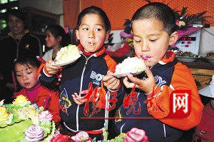踩過“步步糕”和“子孫蛋”后,儀式最重要的部分開始了。當(dāng)年的主刀醫(yī)生、南京市兒童醫(yī)院新生兒外科徐小群主任醫(yī)師和護士長夏娟各剪斷了一條尾巴,并送上了禮物——兩個書包。一下子見到那么多生人,兩個孩子似乎有點不太適應(yīng),連平日里一向活潑的蘇寧也變得沉默寡言起來。只有在吹完蠟燭吃蛋糕時,兩個孩子才放松下來,丟下手中的叉子直接啃起了蛋糕。