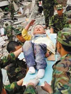 【當(dāng)初】:在地震發(fā)生十余小時(shí)后,一位滿臉是血的男孩終于被武警官兵從廢墟中救出。男孩的左手骨折,一位戰(zhàn)士用木板小心地夾住他的手臂,纏上了繃帶,又慢慢地給男孩喂了一些礦泉水。把男孩放在一塊藍(lán)色的木板上后,武警官兵準(zhǔn)備把他轉(zhuǎn)移到安全地帶,然而,就在這時(shí),令人動(dòng)容的一幕出現(xiàn)了:年幼的男孩艱難地舉起尚能動(dòng)彈的右手,虛弱而又標(biāo)準(zhǔn)地敬了一個(gè)少先隊(duì)隊(duì)禮。